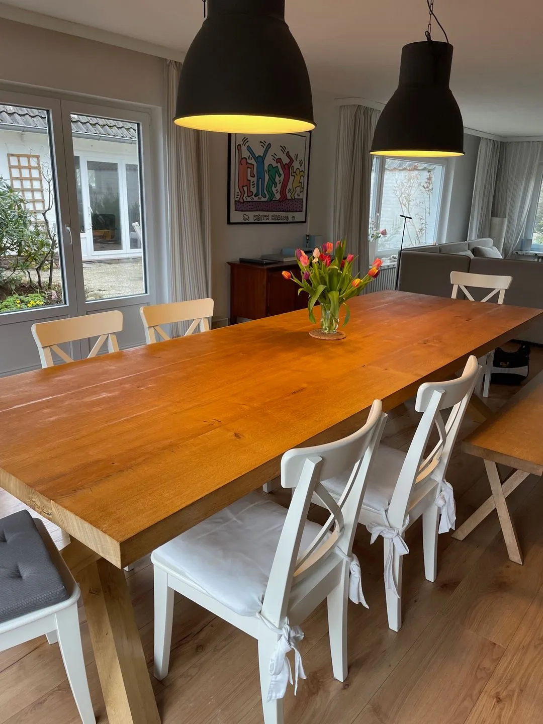 Ein schönes Haus mit viel Platz, Rückzugsorten und einem wunderbaren Wohnzimmer mit großem Sofa und einem tollen Tisch, der viel Platz zum Essen und Spielen bietet.