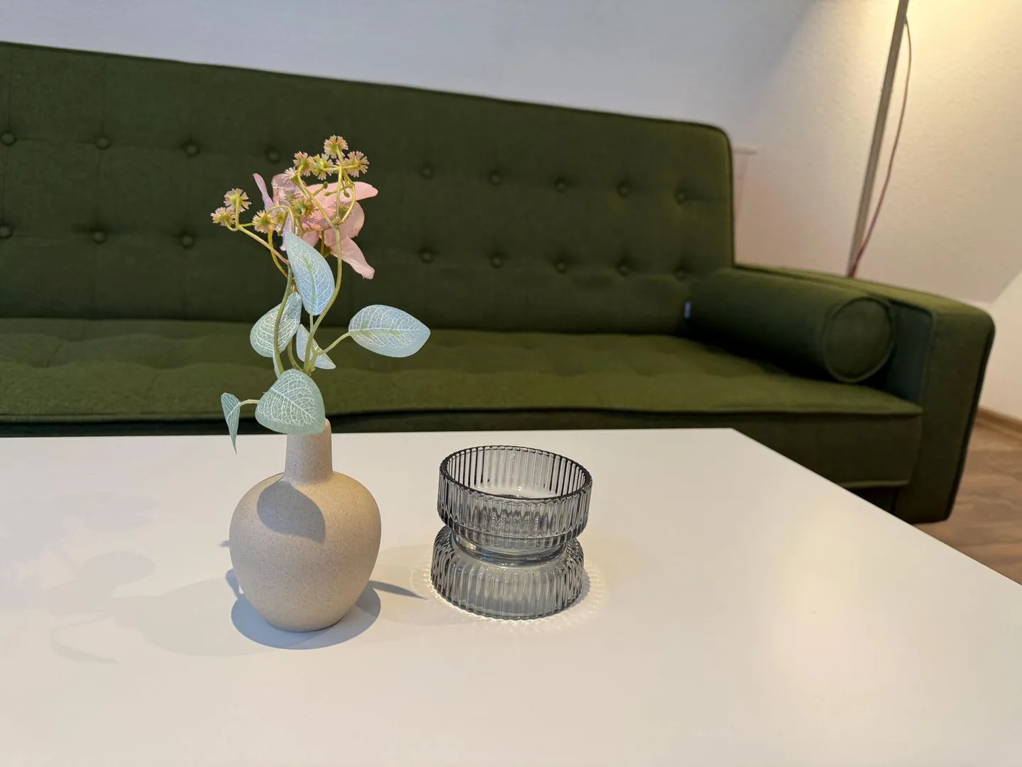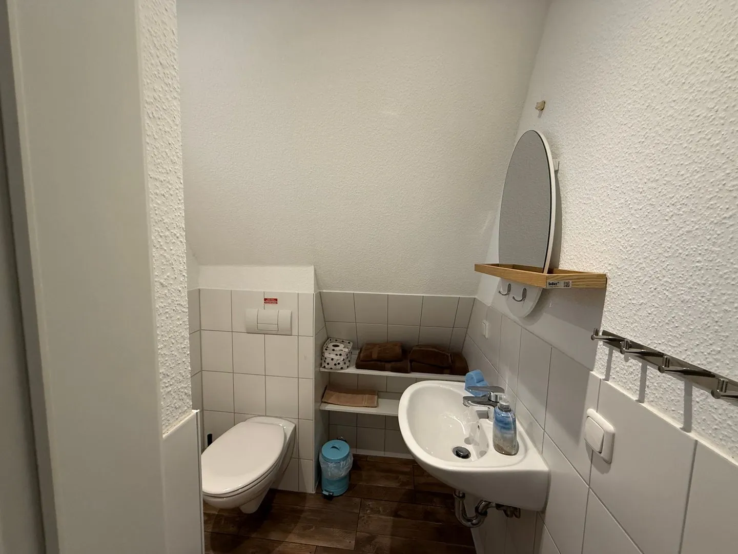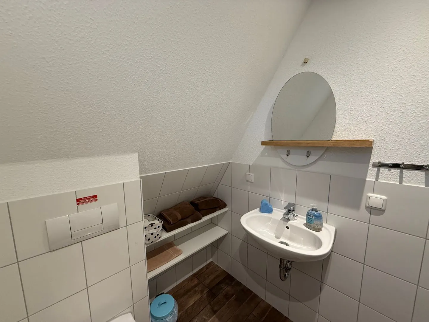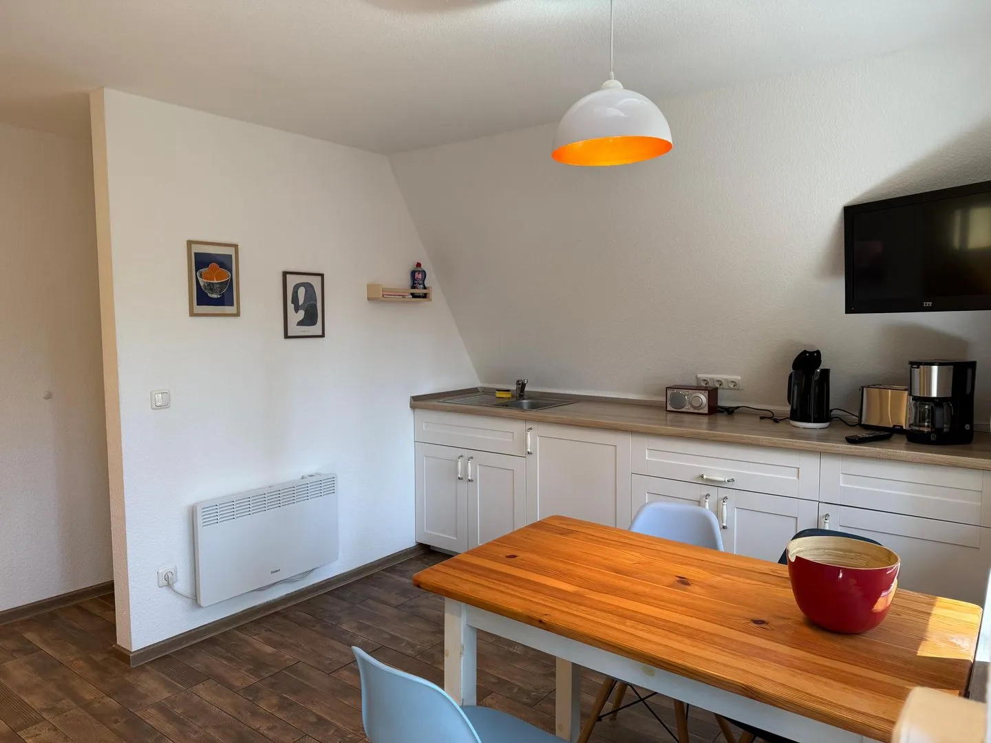 Die kleine Küchenzeile hat alles, was es für große Urlaubsgerichte braucht: Herd mit zwei Platten, Kühlschrank mit Gefrierfach, Kaffeemaschine, Toaster, Wasserkocher – dazu Geschirr und Besteck für vier Personen. Sollte einmal etwas fehlen: einfach melden, wir sorgen dafür. Daneben das eigene Duschbad mit WC – klein, aber fein und ganz für Sie allein.