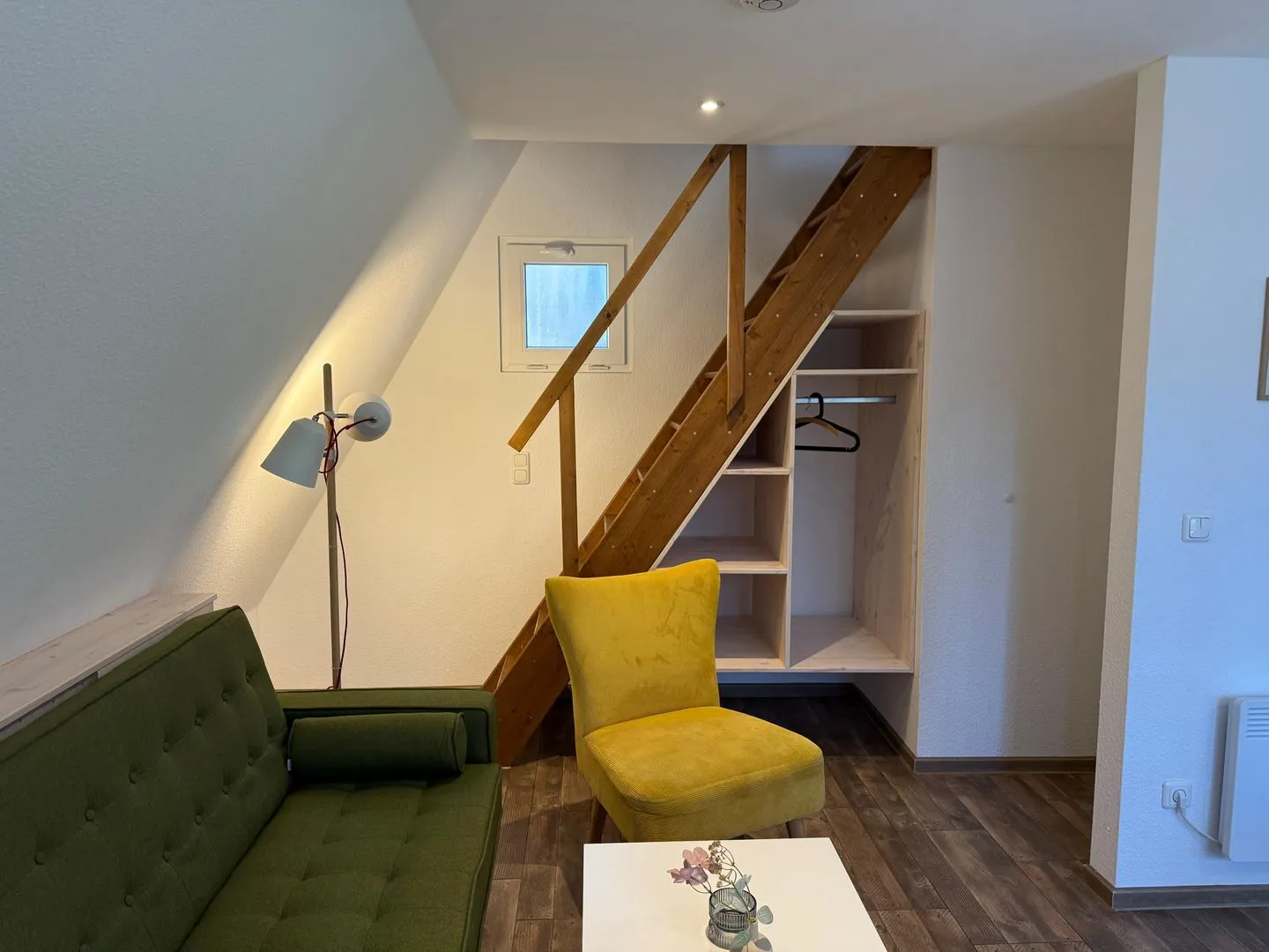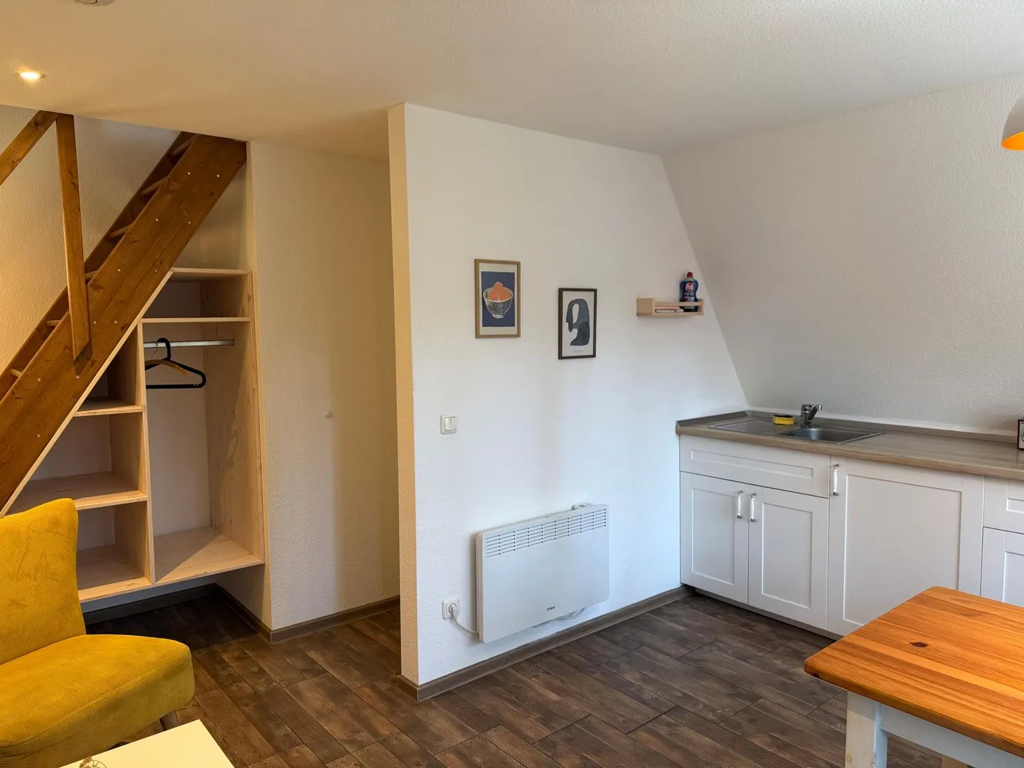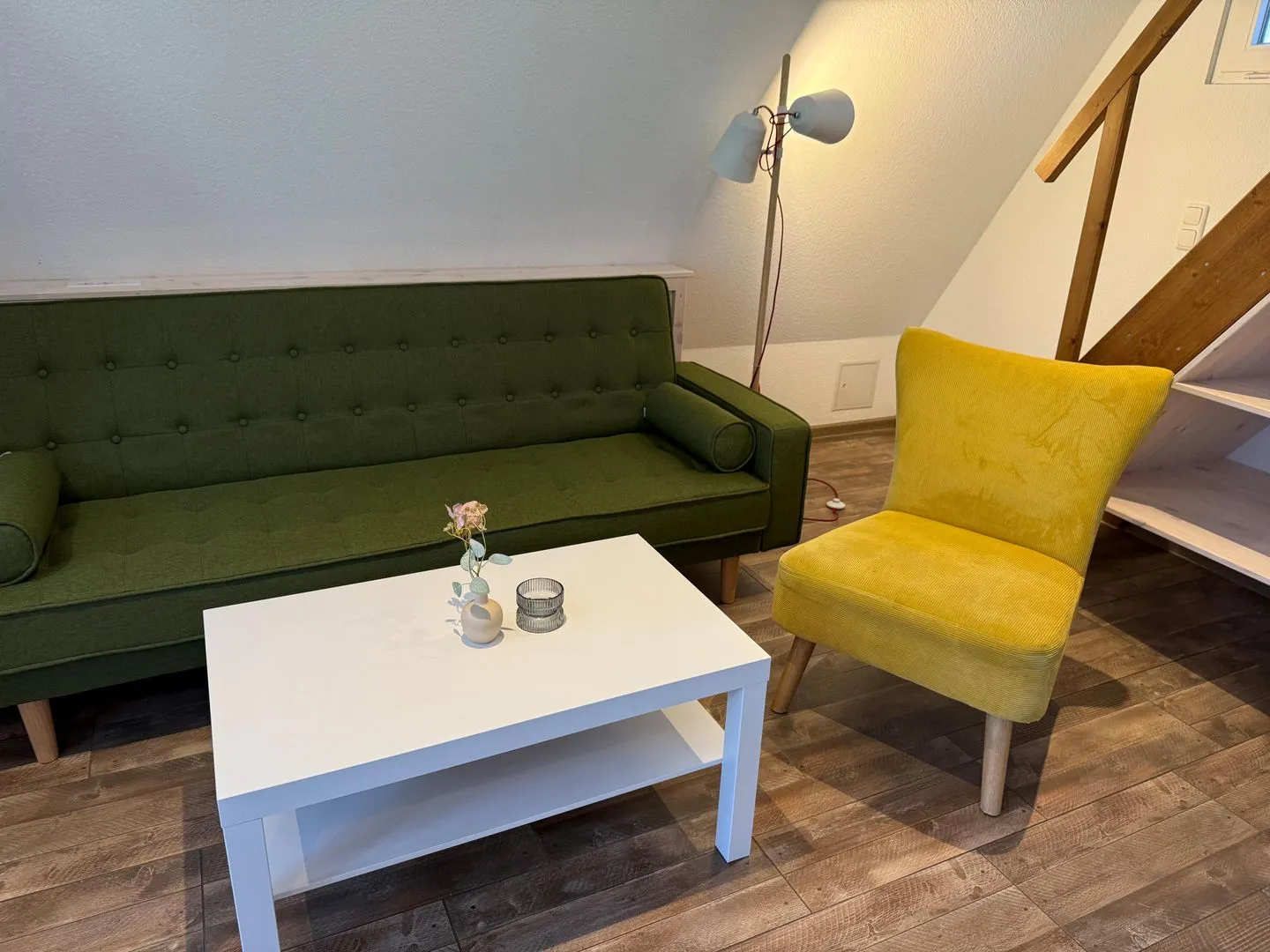 Drinnen warten ca. 30 m², die mehr können, als man denkt. Im Wohnzimmer treffen Sofa, Tisch und Stühle auf eine große Terrassentür, die den Wald direkt ins Haus holt. Die Schlafgalerie unterm Dach ist kuschelig und luftig zugleich – vier Betten für Erwachsene oder Kinder. IAlles schlicht, praktisch, ein bisschen skandinavisch – und mit Heizung für kühle Abende.