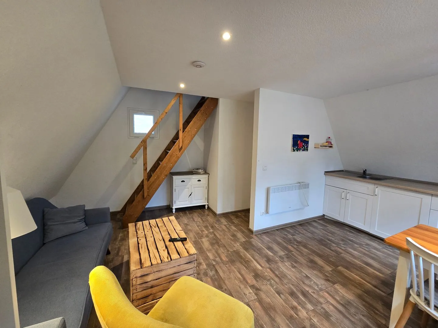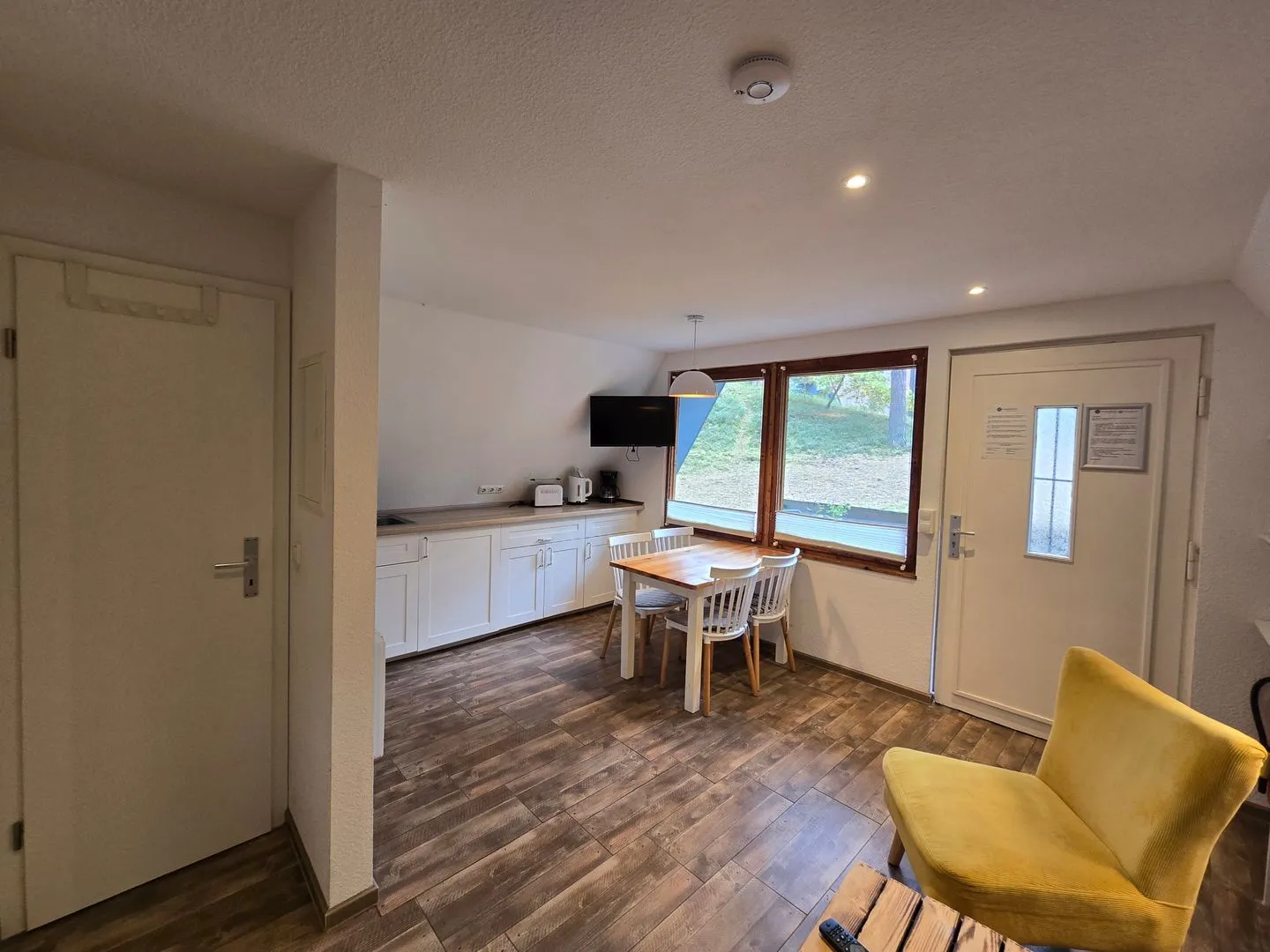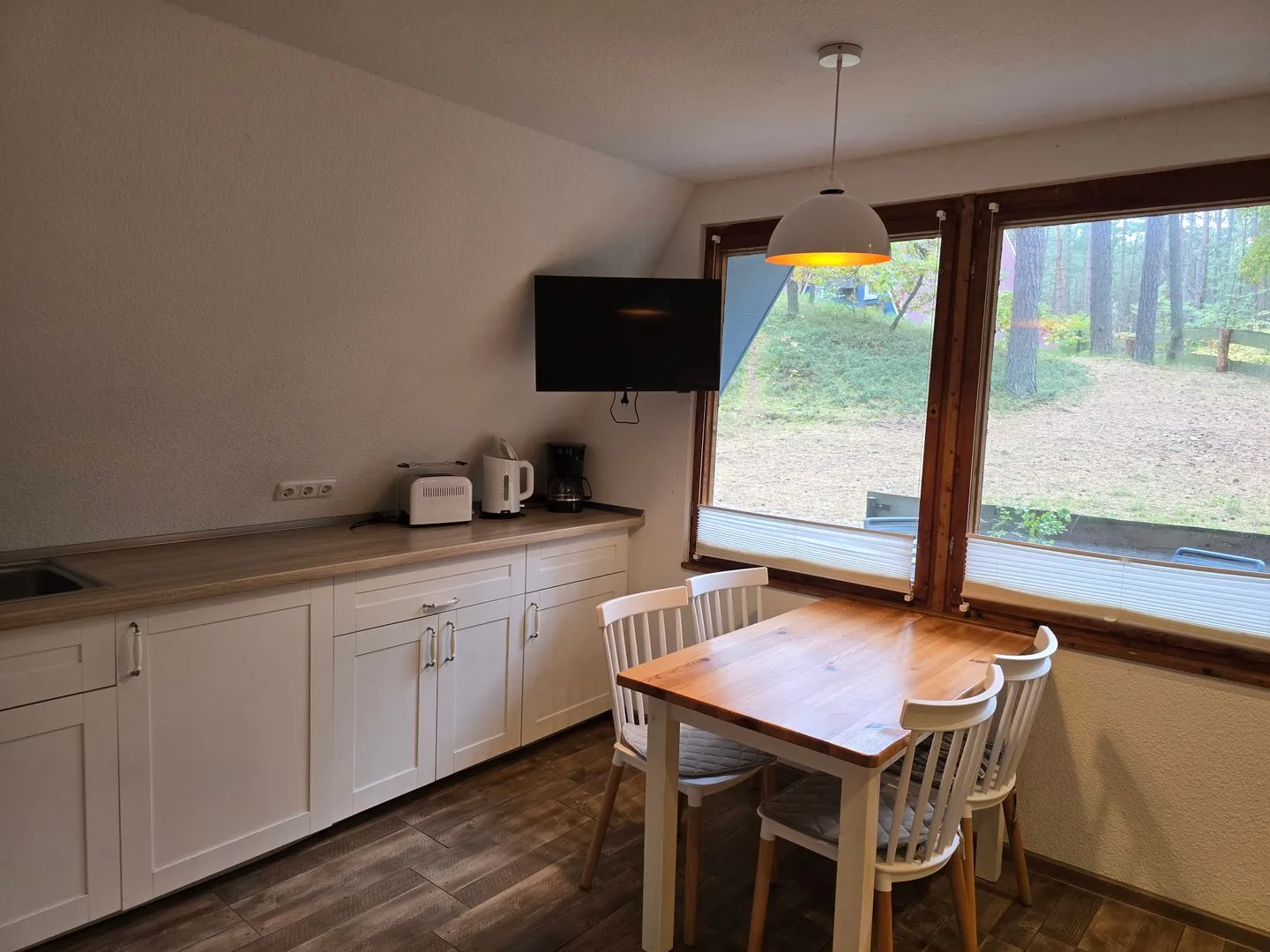 Drinnen warten ca. 30 m², die mehr können, als man denkt. Im Wohnzimmer treffen Sofa, Tisch und Stühle auf eine große Terrassentür, die den Wald direkt ins Haus holt. Die Schlafgalerie unterm Dach ist kuschelig und luftig zugleich – vier Betten für Erwachsene oder Kinder. IAlles schlicht, praktisch, ein bisschen skandinavisch – und mit Heizung für kühle Abende.