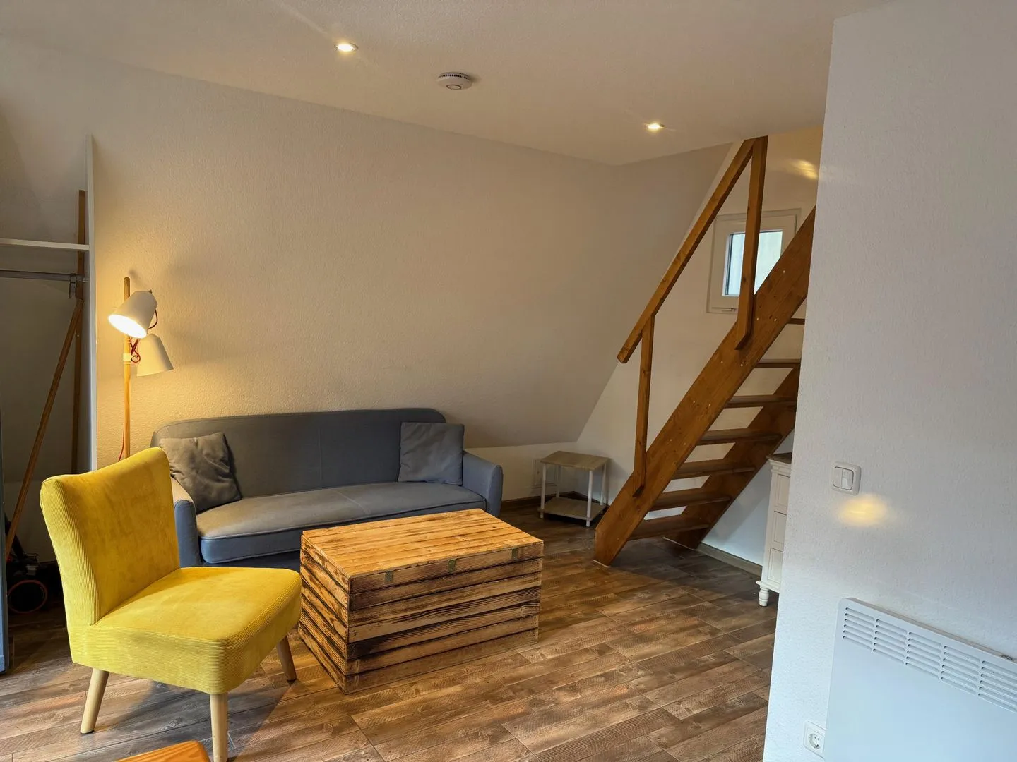 Drinnen warten ca. 30 m², die mehr können, als man denkt. Im Wohnzimmer treffen Sofa, Tisch und Stühle auf eine große Terrassentür, die den Wald direkt ins Haus holt. Die Schlafgalerie unterm Dach ist kuschelig und luftig zugleich – vier Betten für Erwachsene oder Kinder. IAlles schlicht, praktisch, ein bisschen skandinavisch – und mit Heizung für kühle Abende.