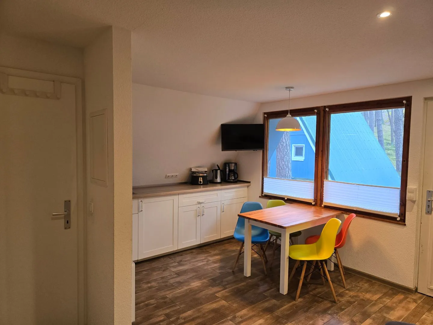 Drinnen warten ca. 30 m², die mehr können, als man denkt. Im Wohnzimmer treffen Sofa, Tisch und Stühle auf eine große Terrassentür, die den Wald direkt ins Haus holt. Die Schlafgalerie unterm Dach ist kuschelig und luftig zugleich – vier Betten für Erwachsene oder Kinder. IAlles schlicht, praktisch, ein bisschen skandinavisch – und mit Heizung für kühle Abende.