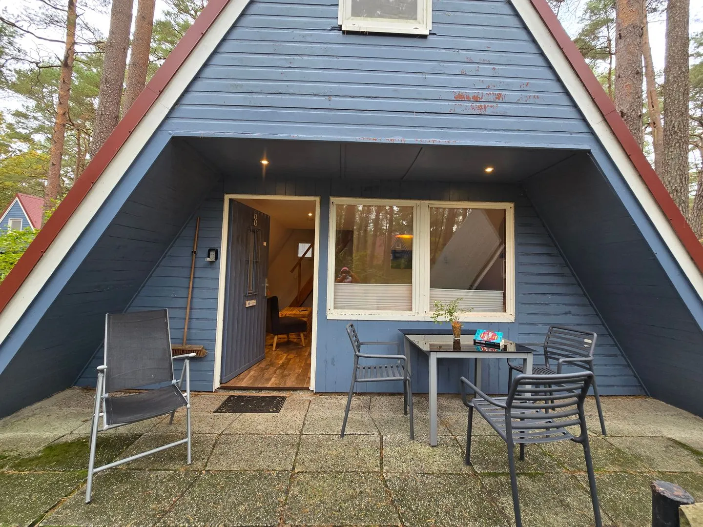 Vor der Hütte liegt die Terrasse. Ein Tisch, Stühle, etwas Wiese, drumherum Kiefern. Hier schmeckt der Morgenkaffee nach Salz und Sonne. Wer möchte, bringt den Hund mit – ein Hund pro Hütte ist willkommen. Bettwäsche und Handtücher können Sie gern selbst mitbringen oder unkompliziert bei uns mieten.