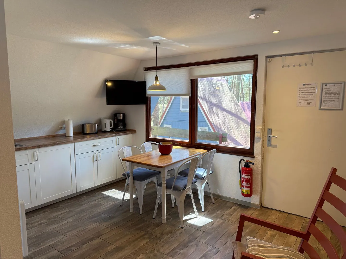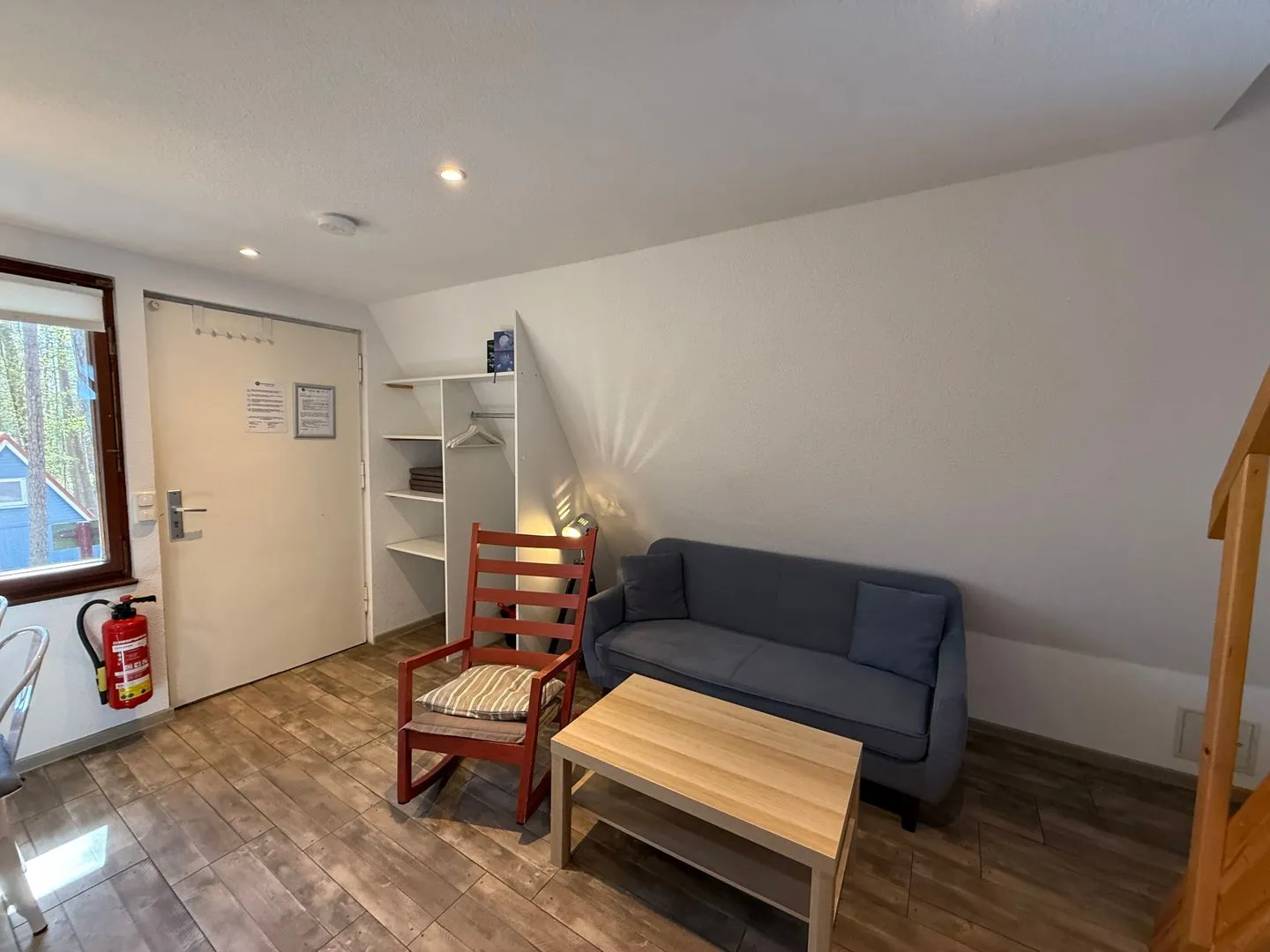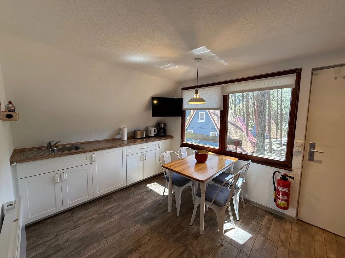 Drinnen warten ca. 30 m², die mehr können, als man denkt. Im Wohnzimmer treffen Sofa, Tisch und Stühle auf eine große Terrassentür, die den Wald direkt ins Haus holt. Die Schlafgalerie unterm Dach ist kuschelig und luftig zugleich – vier Betten für Erwachsene oder Kinder. IAlles schlicht, praktisch, ein bisschen skandinavisch – und mit Heizung für kühle Abende.