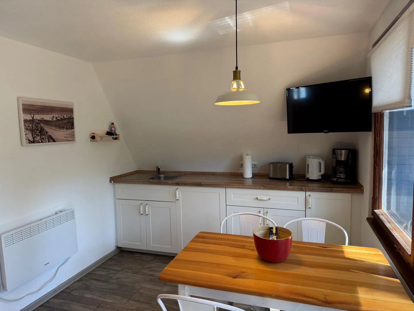 Die kleine Küchenzeile hat alles, was es für große Urlaubsgerichte braucht: Herd mit zwei Platten, Kühlschrank mit Gefrierfach, Kaffeemaschine, Toaster, Wasserkocher – dazu Geschirr und Besteck für vier Personen. Sollte einmal etwas fehlen: einfach melden, wir sorgen dafür. Daneben das eigene Duschbad mit WC – klein, aber fein und ganz für Sie allein.