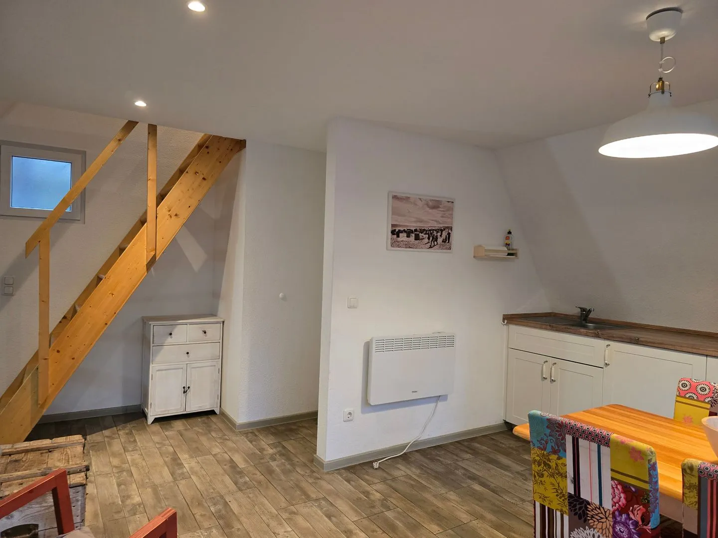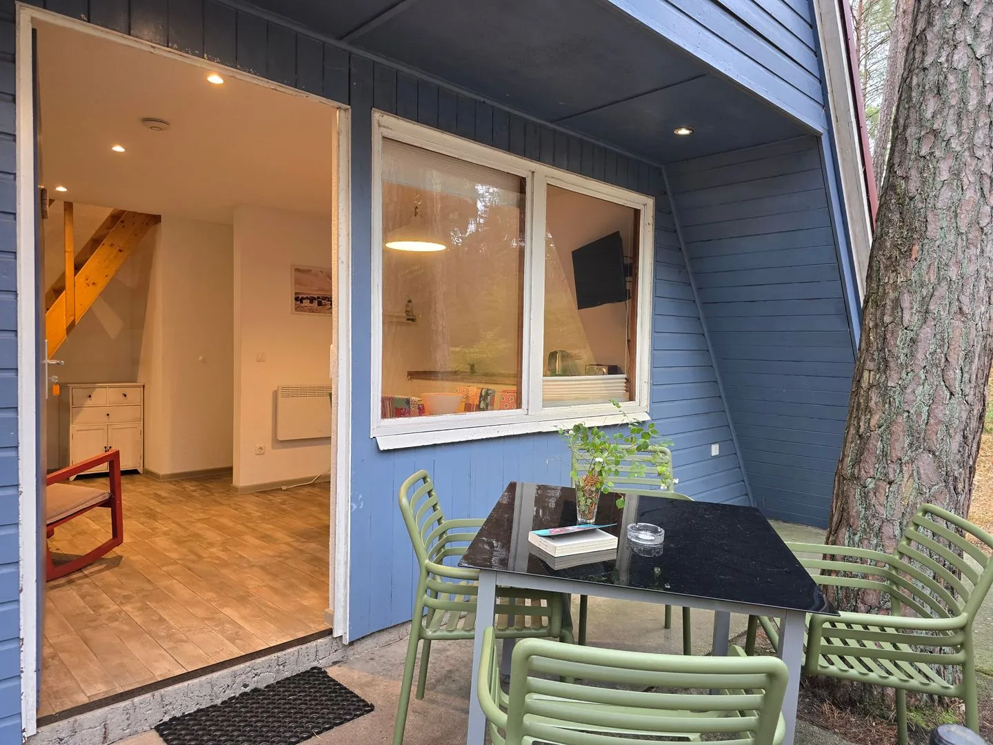 Drinnen warten ca. 30 m², die mehr können, als man denkt. Im Wohnzimmer treffen Sofa, Tisch und Stühle auf eine große Terrassentür, die den Wald direkt ins Haus holt. Die Schlafgalerie unterm Dach ist kuschelig und luftig zugleich – vier Betten für Erwachsene oder Kinder. IAlles schlicht, praktisch, ein bisschen skandinavisch – und mit Heizung für kühle Abende.