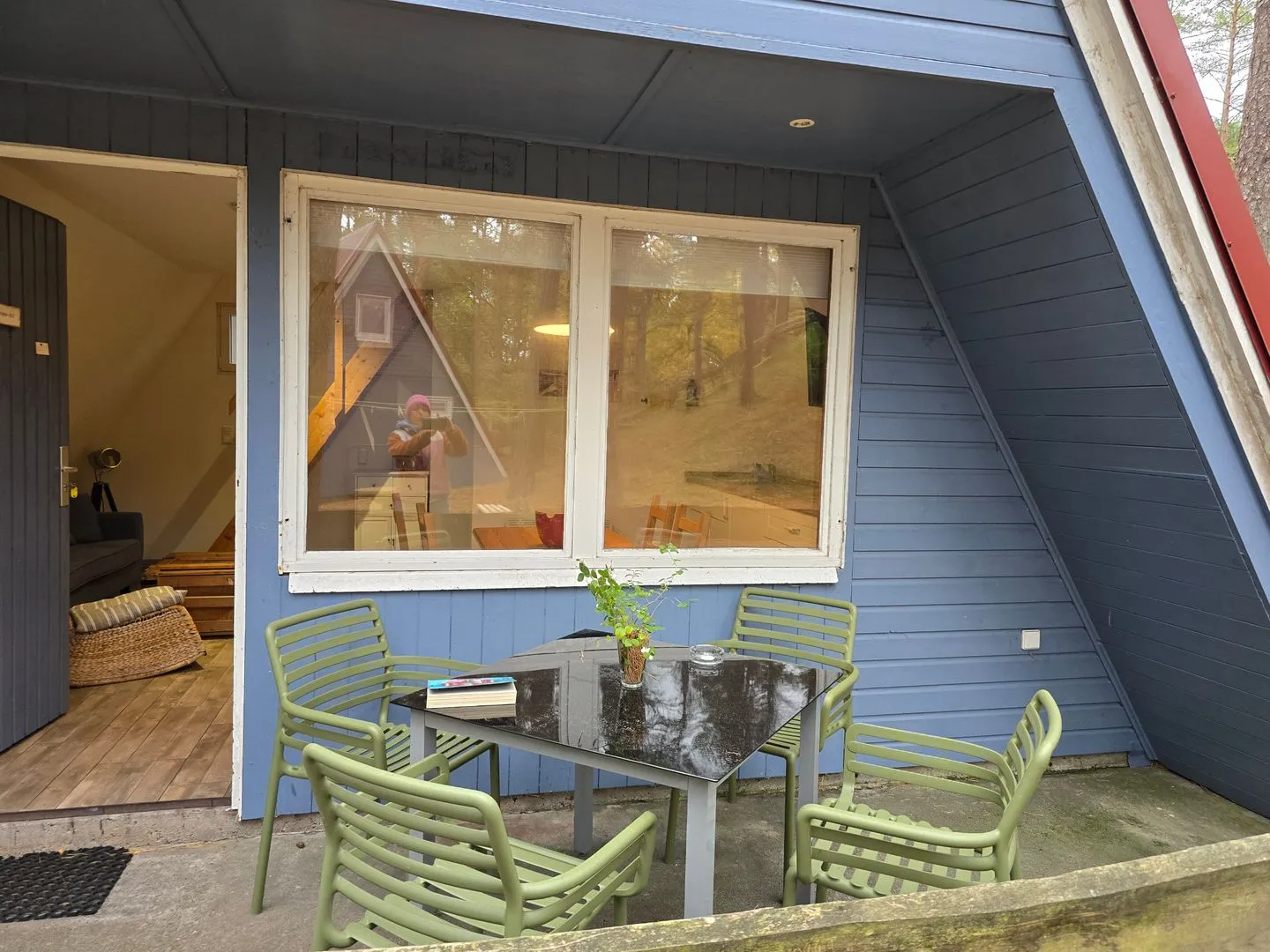 Drinnen warten ca. 30 m², die mehr können, als man denkt. Im Wohnzimmer treffen Sofa, Tisch und Stühle auf eine große Terrassentür, die den Wald direkt ins Haus holt. Die Schlafgalerie unterm Dach ist kuschelig und luftig zugleich – vier Betten für Erwachsene oder Kinder. IAlles schlicht, praktisch, ein bisschen skandinavisch – und mit Heizung für kühle Abende.
